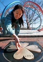 <写真:07年分のハート形のプレート(手前)が埋め込まれ完成した四つ葉のクローバー>